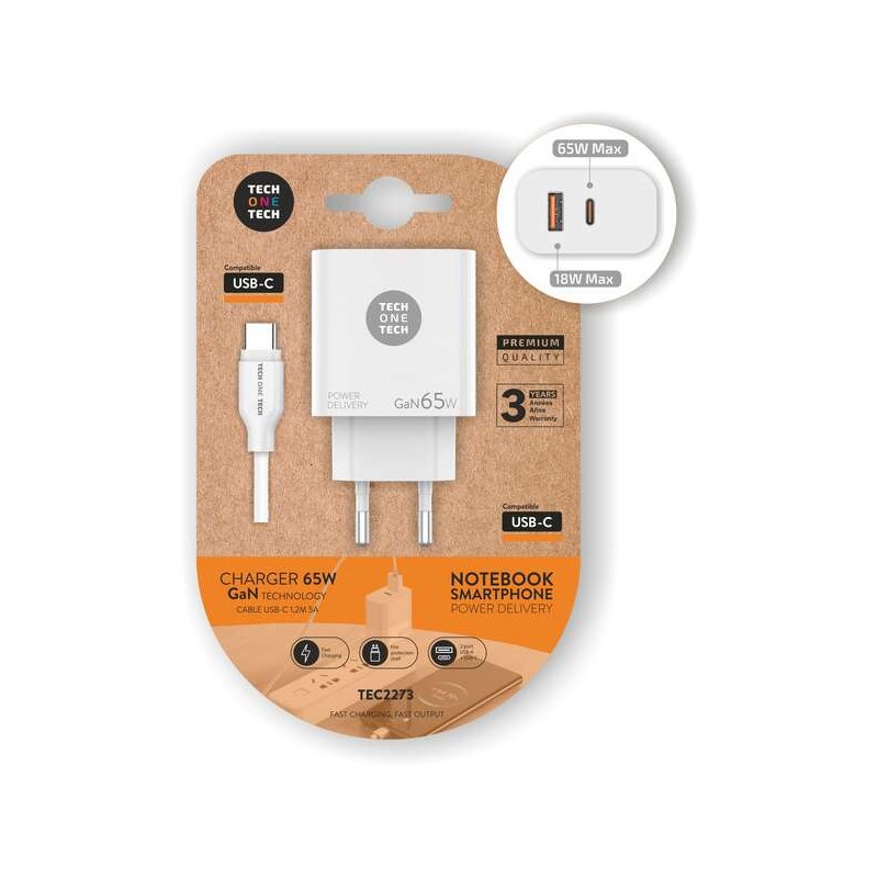 Caricatore da muro TechOneTech GaN PD 3.0 65W - Per laptop e smartphone - Cavo da USB-C a USB-C 1 m