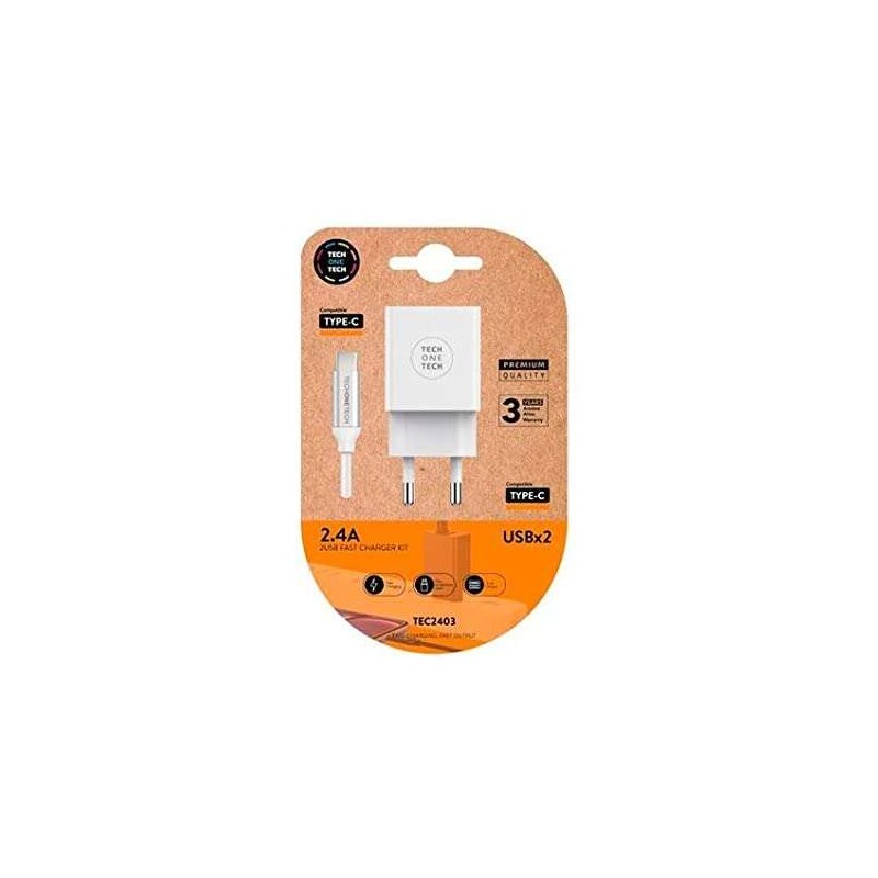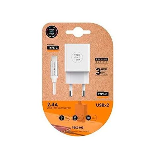 Caricatore a doppia parete + cavo da USB-A a USB-C. Specifiche: Caricabatterie: -Numero di porte USB: 2 -Corrente in uscita: 2,4 A Cavo: -USB-A: maschio -USB-C: maschio -Rivestimento in nylon intrecciato -Lunghezza: 1 m -Colore: Bianco