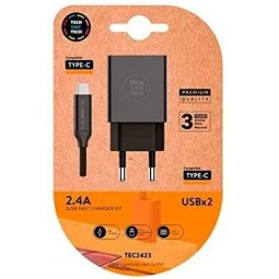 Caricatore a doppia parete + cavo da USB-A a USB-C. Specifiche: Caricabatterie: -Numero di porte USB: 2 -Corrente in uscita: 2,4 A Cavo: -USB-A: maschio -USB-C: maschio -Rivestimento in nylon intrecciato -Lunghezza: 1 m -Colore: Nero