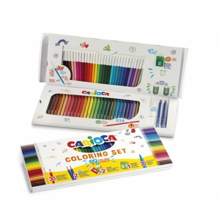 Confezione da colorare Carioca Joy 65 pezzi - 30 pennarelli super lavabili - 30 matite colorate super resistenti - 2 gomme - 2 matite di grafite HB - 1 temperamatite con serbatoio