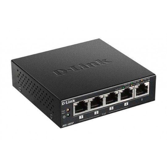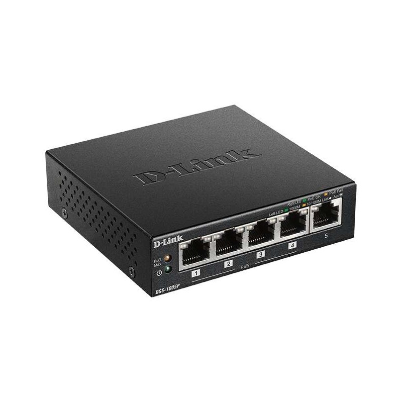 Switch Poe+ Gigabit Ethernet veloce D-Link. Compatto. Comodo. Lo switch Gigabit a 5 porte D?Link DGS?1005P consente di connettersi alla rete dati e alimentare dispositivi Power over Ethernet (PoE) come punti di accesso Wi-Fi (AP), telecamere di sorveglianza IP e telefoni IP. È un interruttore compatto, con involucro metallico e funziona silenziosamente. È Plug & Play, quindi non è richiesta alcuna conoscenza tecnica. Prestazioni Gigabit. DGS-1005P ha un''installazione plug-and-play e non richiede configurazione. Il supporto automatico MDI/MDI-X su tutte le porte elimina la necessità di cavi incrociati durante la connessione a un altro switch, mentre la negoziazione automatica su ciascuna porta regola in modo intelligente la velocità della porta per supportare il dispositivo co